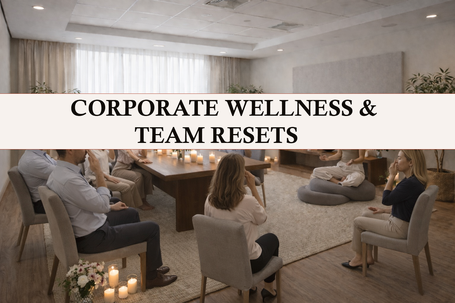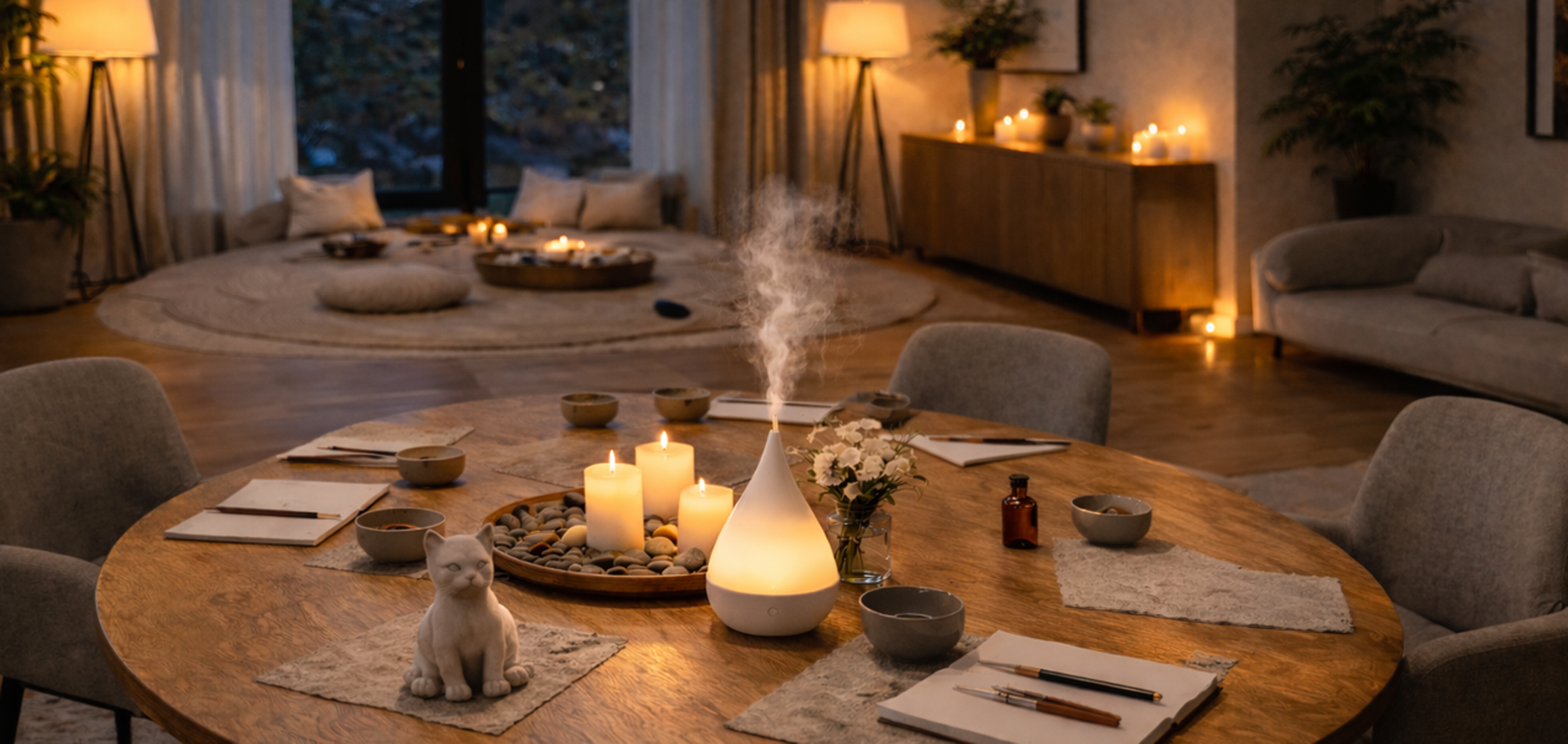 On-site facilitation — we come to you and thoughtfully transform your space through lighting, music, and subtle sensory elements
