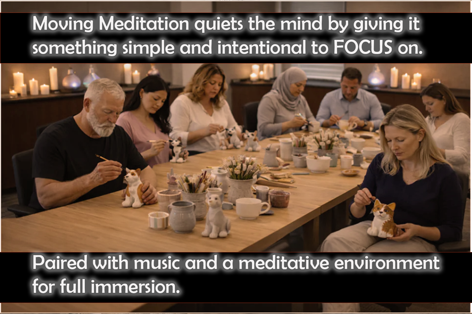 A guided creative process — a hands-on experience that naturally slows mental overdrive and supports clear thinking and authentic connection